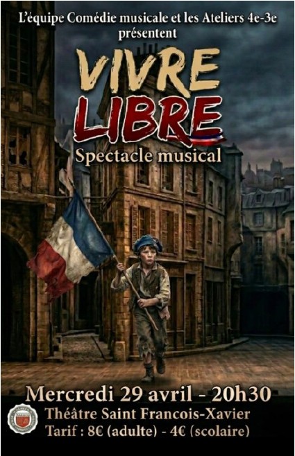 mercredi 29 avril à 20h30 : comédie musicale "Vivre libre" par l'équipe Comédie musicale et l'atelier arts et spectacles 4ème/3ème